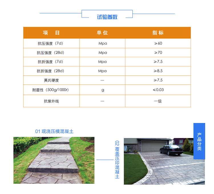 彩色混凝土壓花,壓印,壓模地坪產(chǎn)品是一種全新施工理念的彩色混凝土裝飾面層材料,圖案和顏色任意組臺(tái),整體成型一次性鋪裝,抗壓強(qiáng)度一般可達(dá)普通混凝土的3倍以上,耐磨、抗壓性好。