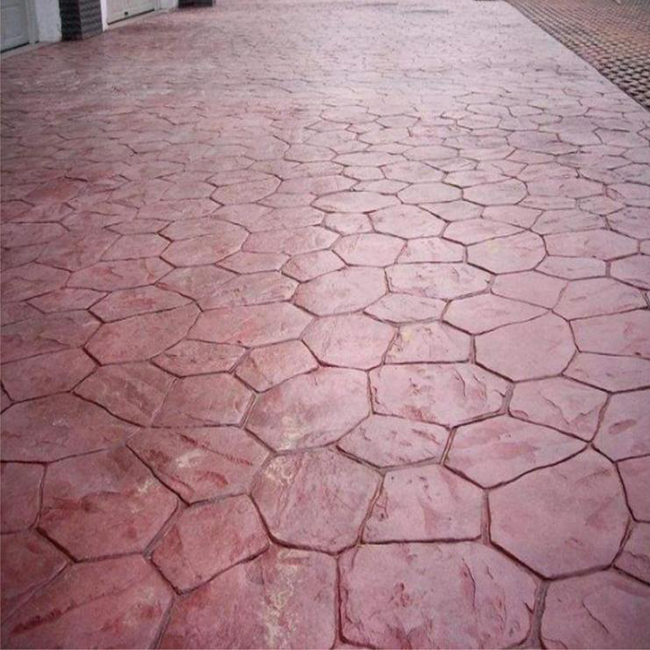 壓模地坪施工流程相對于其他鋪貼而言,操作比較簡單,施工速度也比較快,每班4人日完成量可達3~400平米。而且沒有松動、折斷、脫落的風(fēng)危,值得大力推廣應(yīng)用。